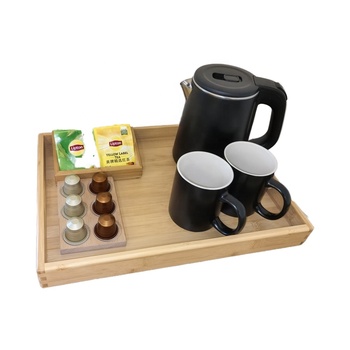 カスタムメイドの木と竹のサービングトレイホテルの寝室のコーヒーバーリビングルームで提供するティーケトル